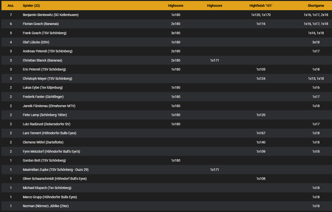 Wir freuen uns auf euch! Näheres zum Ablauf des Abschlussturniers folgt dann die nächsten Tage über die Weekly Open Gruppe durch euren Micha. Das Team rund um Micha, Flo, Maxi, Christian und co. geben sich dabei die größte Mühe euch einen tollen Abschlusstag zu ermöglichen um eine wirklich – so vorher nicht erwartete – tolle Weekly Saison zu krönen. Ziel wie stets, Training, viel viel Spaß und ein einfaches Wohl fühlen unter gleichgesinnten. Danke an euch alle 184 verschiedene Spieler, dass ihr dieses Jahr teil der Weekly Open Gemeinschaft wart. Wir hatten tolle Darts, viele nette Gespräche, einige umgekippte Getränke, die ein oder andere neue Bekanntschaft, junge Nachwuchstalente entdeckt, neue Spielgruppen haben sich gefunden, alte Freundschaften vertieft… all das und mehr… einfach ein toller Erfolg für alle.
