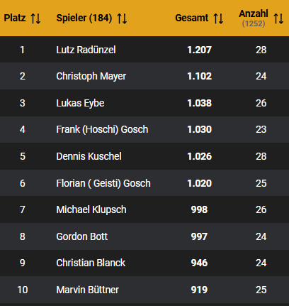Qualifiziert für das Endturnier sind damit nun 50 Spieler. Wahnsinn! Auch wenn am Ende leider nicht alle dabei sein können ist damit eine schöne Abschluss Party garantiert. Mit Lutz und Kuschel haben wir sogar zwei Spieler die wirklich alle 28 Termine vor Ort waren und damit selbst alle Turnierleitungsassistenten weit hinter sich ließen! Schön das ihr beide dabei seid! Unsere Top10 des Jahres 2025: