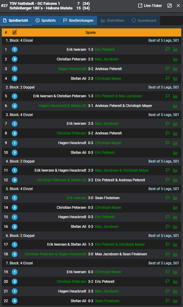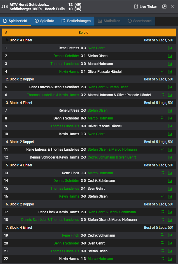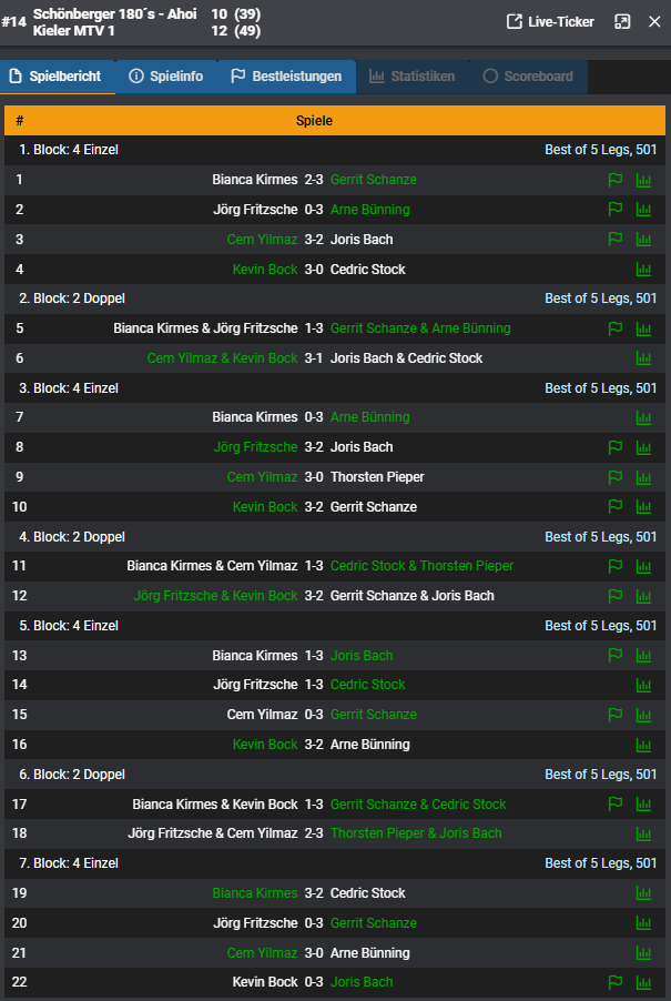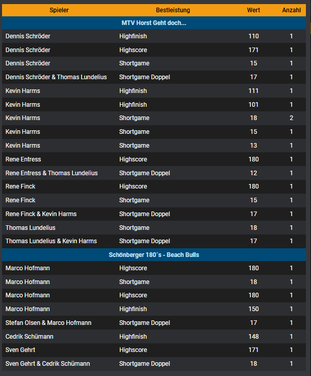 Im Vereinsheim hingegen waren unsere AHOIs rund um Spartenleiter Klupsch mit den Freunden vom KMTV beschäftigt. Auch hier ein knappes Spiel mit dem besseren Ausgang für den KMTV. In Sachen Bestleistungen standen am Ende trotzdem 3 Shortlegs von Cem (1×16, 2×17), eine 180 von Bibi sowie ein 15 Darter von Bocker zu buche.