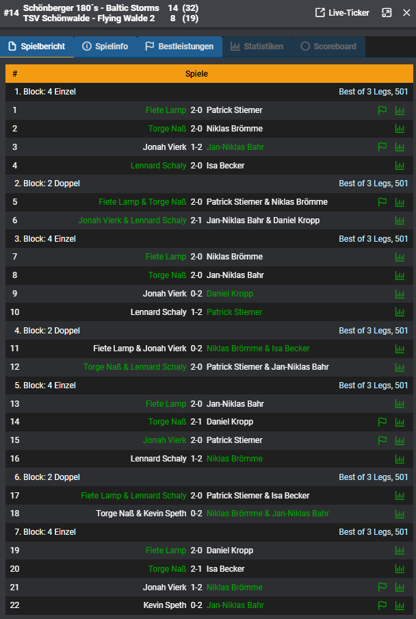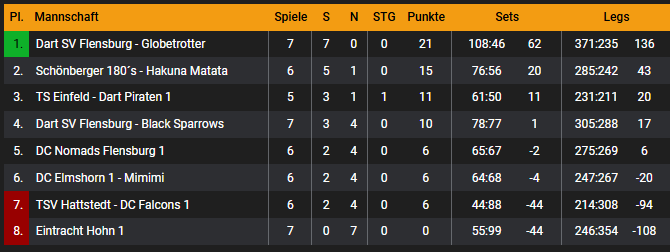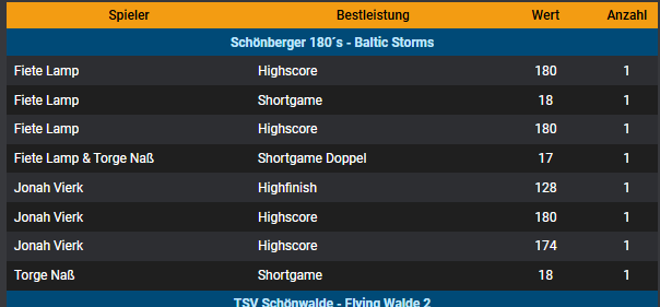In der Fremde spielten auch unsere Bananas. Mit dem Partybus ging es nach Kellenhusen. Leider lief es hier nicht so glatt wie fast schon gewohnt. Am Ende hieß es 7:15 für die Gastgeber. Schade aber kein Beinbruch. Highlights des Tages von Christian eine 180 und zwei Highfinishes von Elian (145) und Leon (150).