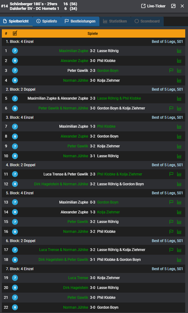 Auch unsere 29er spielten heute im Vereinsheim. Hier lief es gut und ungefährdet von vorne Weg sollten unsere 29er am Ende mit 16:6 triumphieren. Dabei gab es auch gleich zwei 171er von Peter und eine 180 von Norman. Sauber!