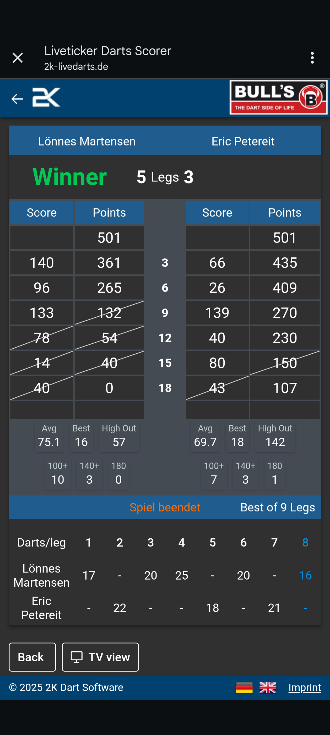 Die Jungs machten es Fiete, Nicardo und Eric besonders gut und landeten im A-Feld während für Niklas das B-Feld an Stand. Fiete musste sich hier leider gleich dem stark spielenden Lönnes geschlagen geben während Nicardo und Eric Spielstark ins Halbfinale wanderten. Hier sollte Nicardo auf Lönnes treffen während es für Eric gegen Ben gehen ging. Im Decider könnte Nicardo leider seine 2 Darts zum Match nicht nutzen und so war auf Platz 3 Ende. Trotz allem eine gute Leistung. Eric hingegen machte kurzen Prozess und zog mit 4 zu 0 und 75er Averages ins Finale gegen Lönnes ein. Eric spielte mega aber müsste sich leider mit 3 zu 5 geschlagen geben. Gratulation Eric zu einem tollen 2. Platz.
