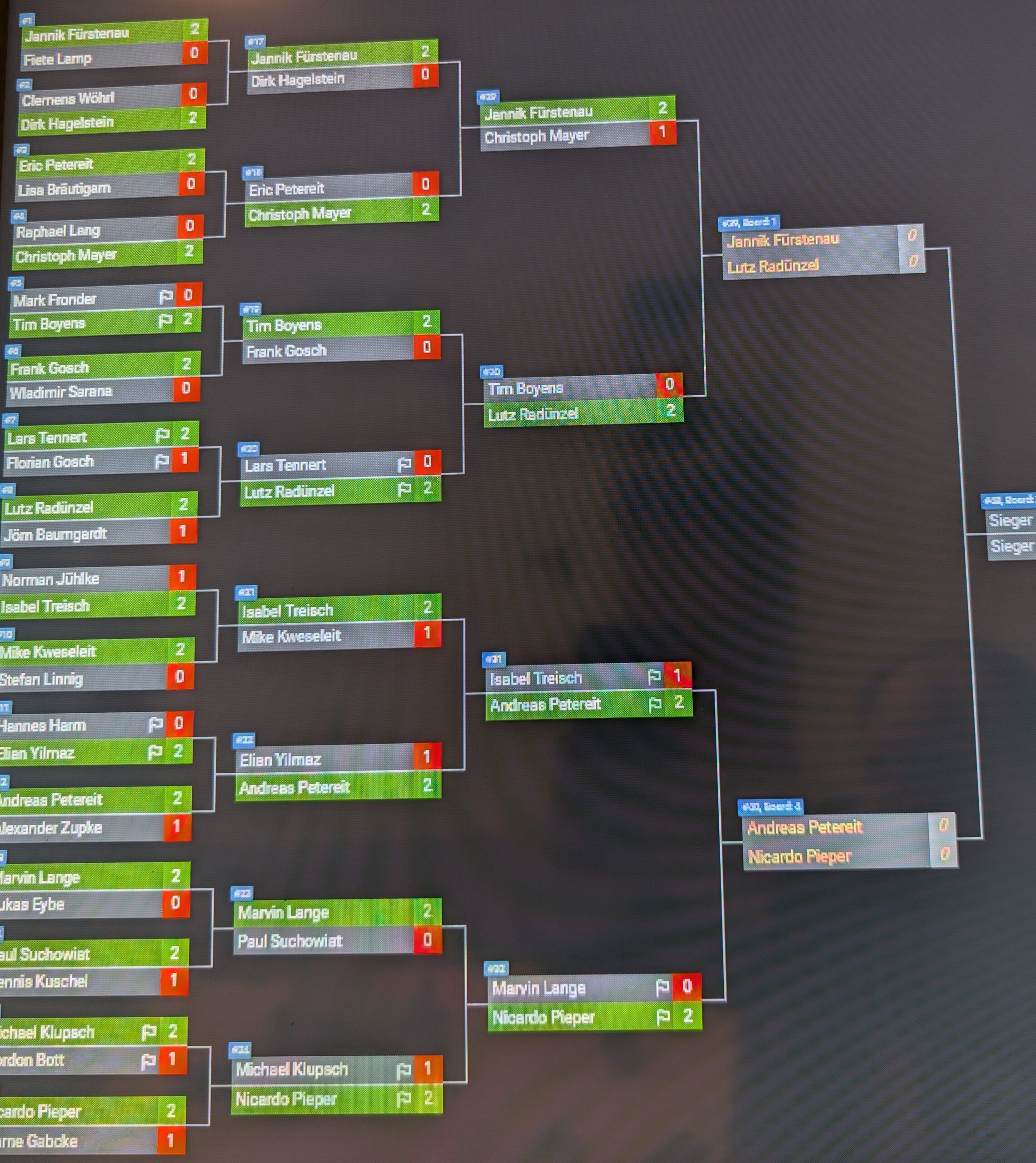 Hier schafften es dann Jannik und Andreas sich irgendwie durchzusetzen und fanden dann im Finale zueinander. Andreas ging hier dann auch schnell mit 2:0 in Front doch Jannik kämpfte sich zurück und gewann letztendlich mit 3:2. Gratulation Jannik, Gratulation Andreas, Lutz und Nicardo!