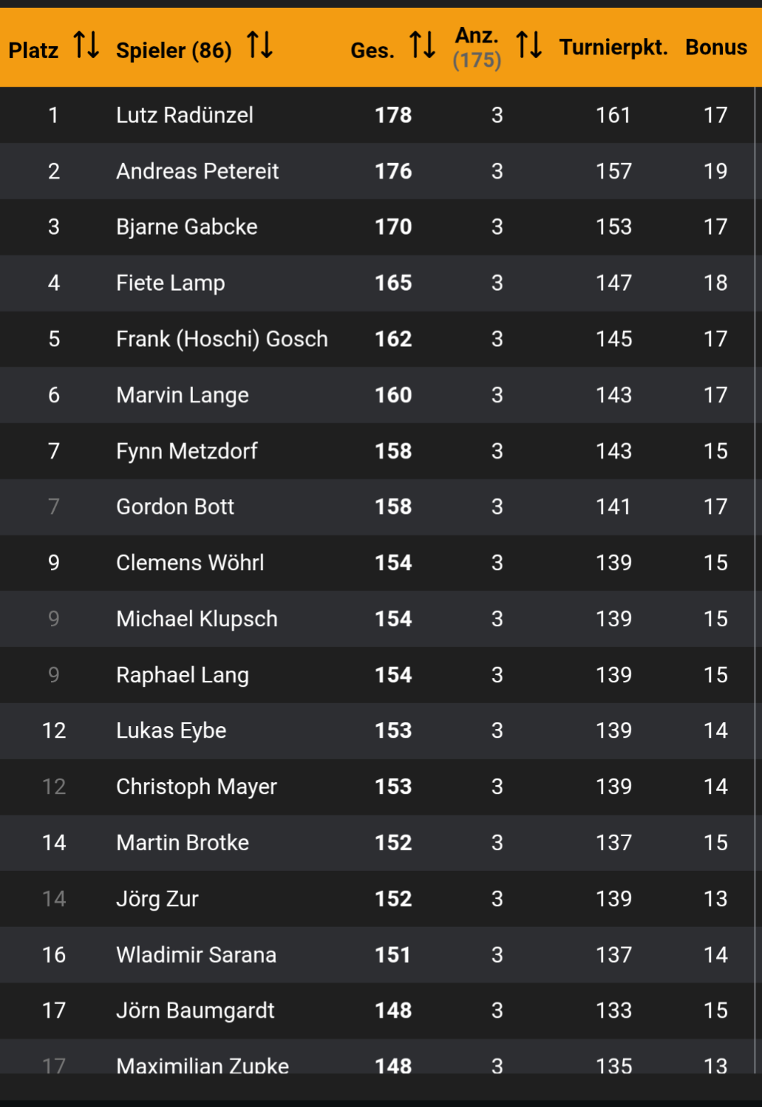 Mit 86 Teilnehmern auch bereits eine krasse Anzahl unterschiedlicher Spieler die sich um ihre Teilnahmen bemühen. Wir Schönberger freuen uns über jeden einzelnen von euch und sagen danke für euer Erscheinen.
