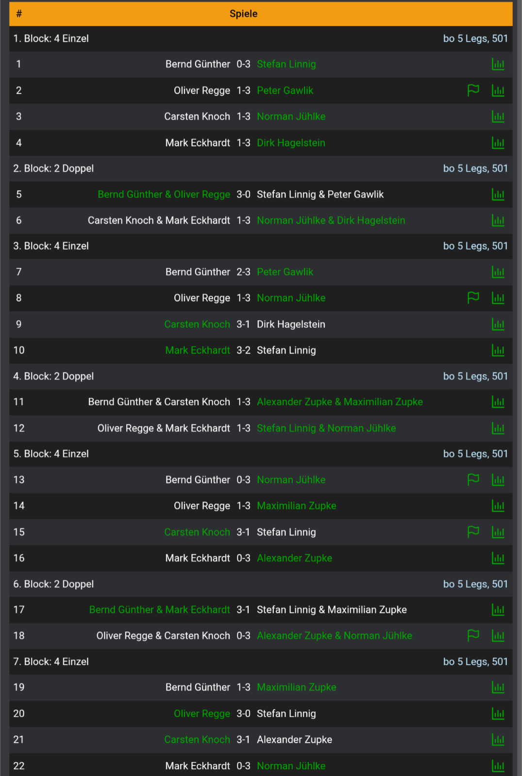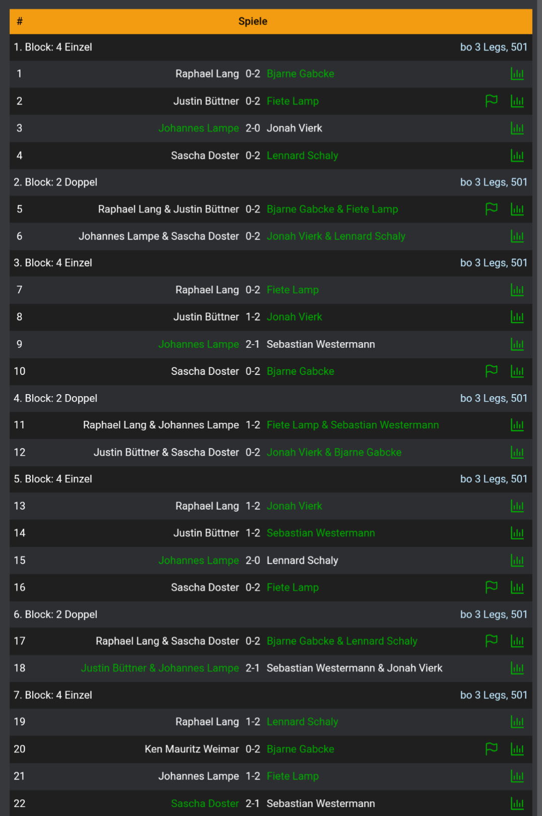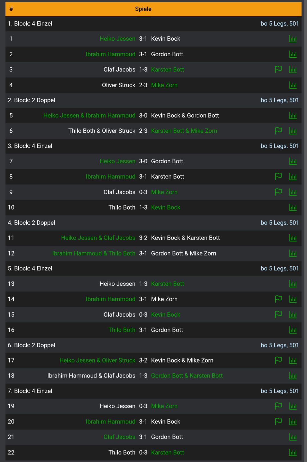 Ebenfalls gewinnen konnten unsere 29er. Beim 15 zu 7 Erfolg spielte Stefan dabei einen 17 Darter und warf eine 171. Peter brachte ebenfalls eine 171 ans Board und Norman spielte einfach mal 16 Darts. Alex hingegen dachte sich wohl was bringen shortlegs und Highscores… Machte er doch einfach 158 aus. Sauber!