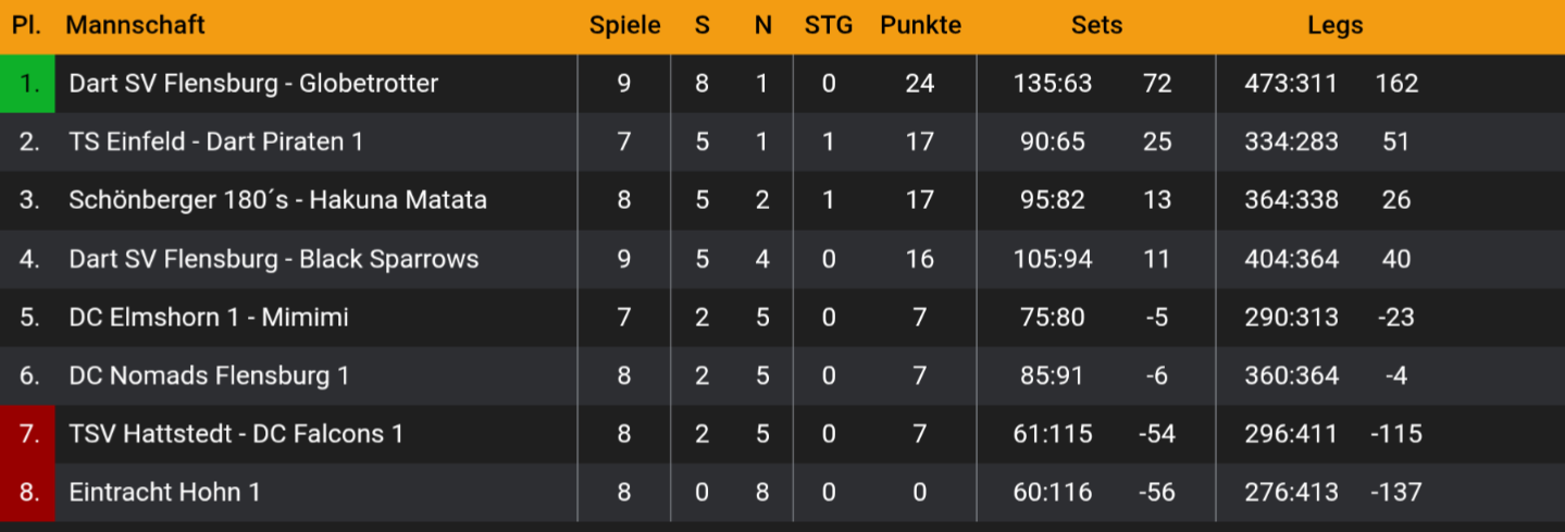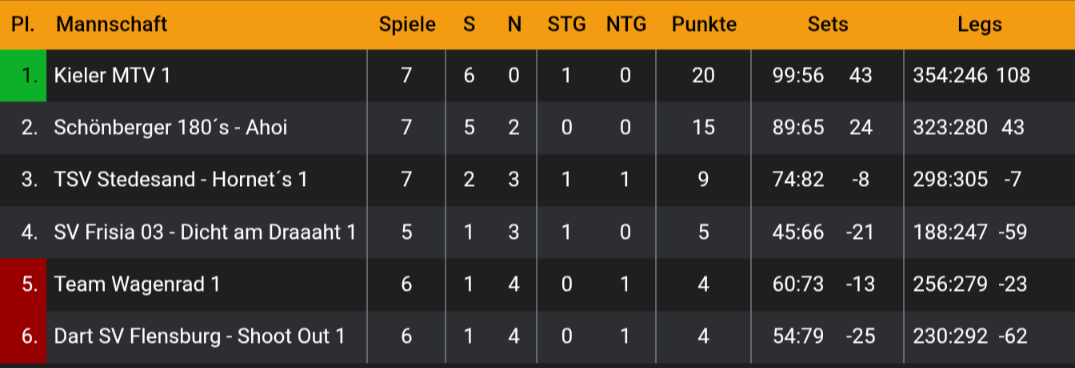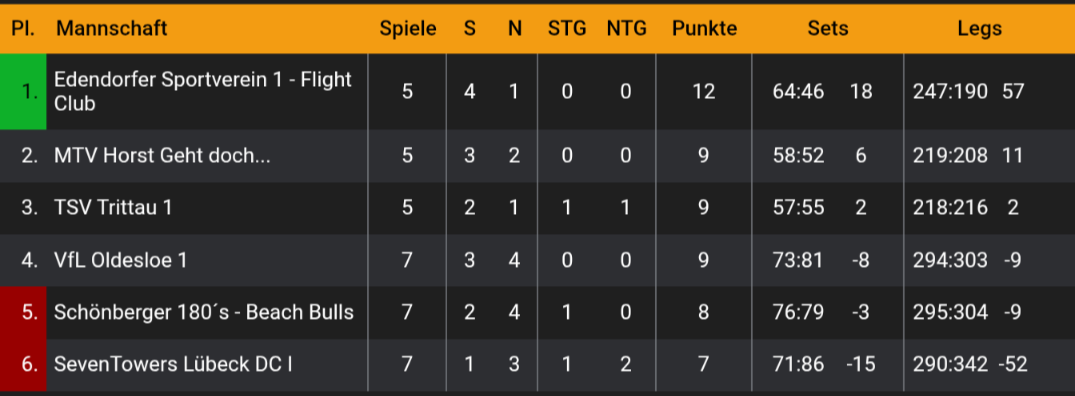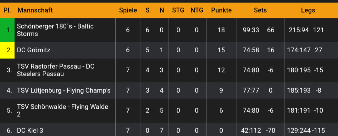 Bei unseren Baltic Stroms geht die Erfolgsspur ebenfalls weiter und weiter und am Ende stand ein 17:5 Erfolg in der Fremde. Dabei spielte Neu-Bundesligist Lamp einen 17 und einen 18 Darter. Im Doppel mit Bjarne gab es dann auch noch einen 15er. Bjarne hingegen spielte 16 und 18 und warf eine 177. Mit Lennard im Doppel gab es dann auch noch einen 18er der die Sache abrundet. 6 Punkte für den TSV.